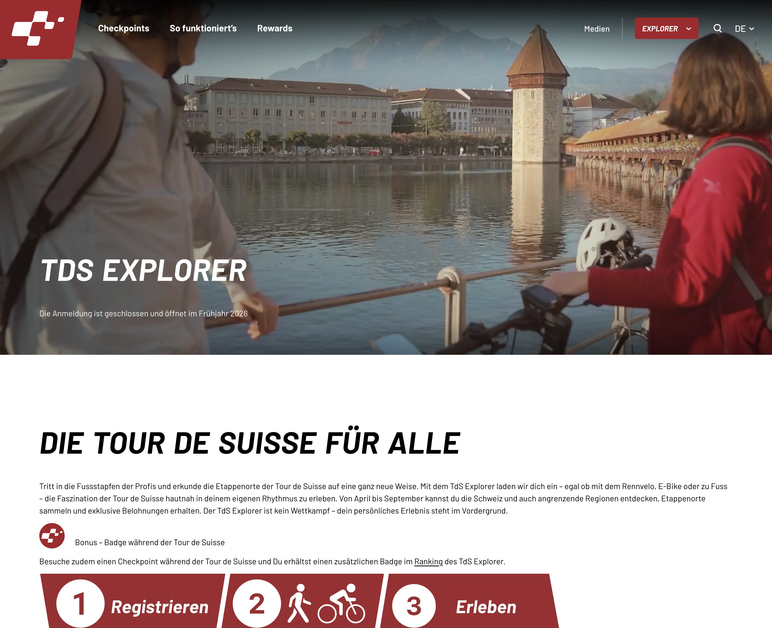 Der TdS Explorer ist eine offene Mitmach-Challenge, mit der jeder – ob Radfahrer, E-Bike-Fahrer oder Fußgänger – die Gastgeber-Städte und Etappenorte der Tour de Suisse besuchen und so aktiv Teil des Events werden kann.